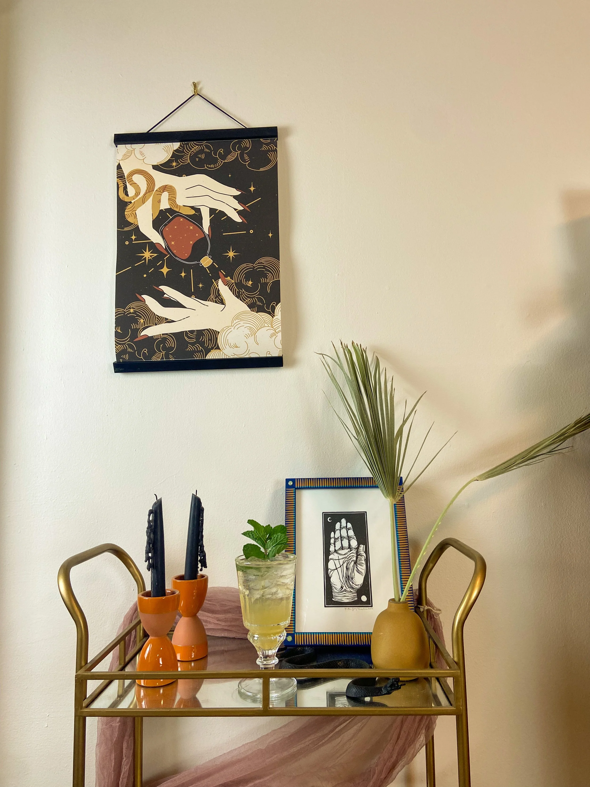 An absinthe frappé in front of palm reading art on a bar cart