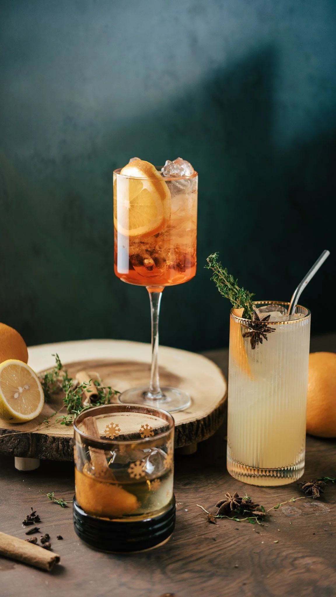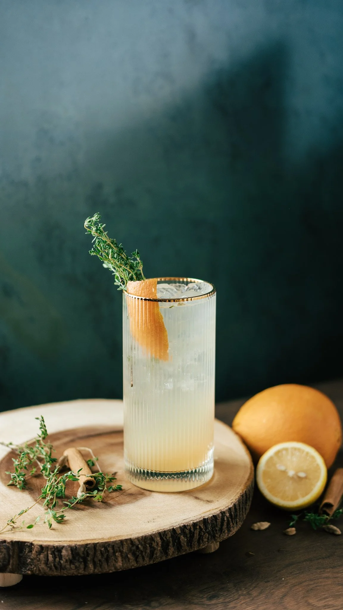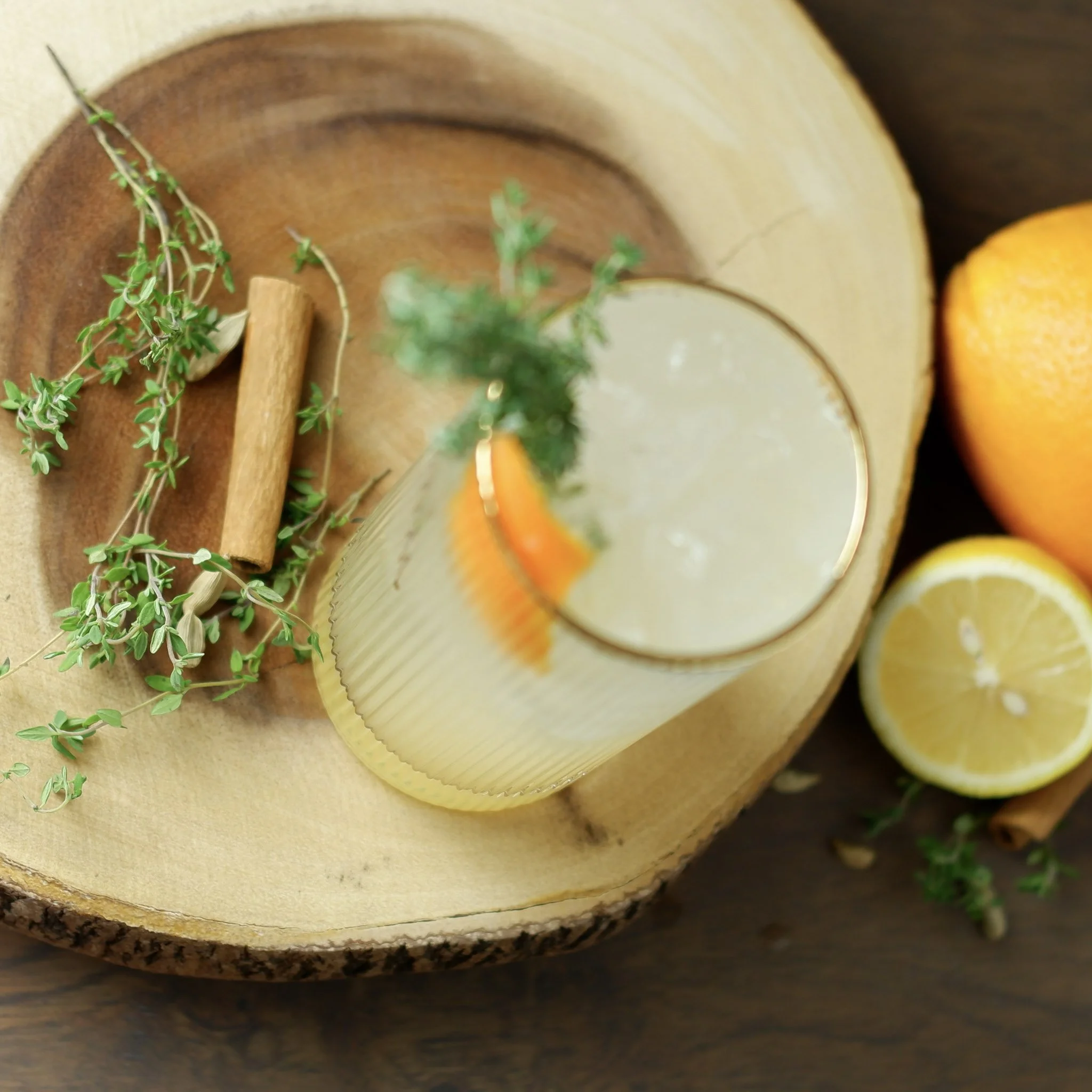- top with orange twist, cinnamon stick, star anise, and a sprig of thyme (optional)