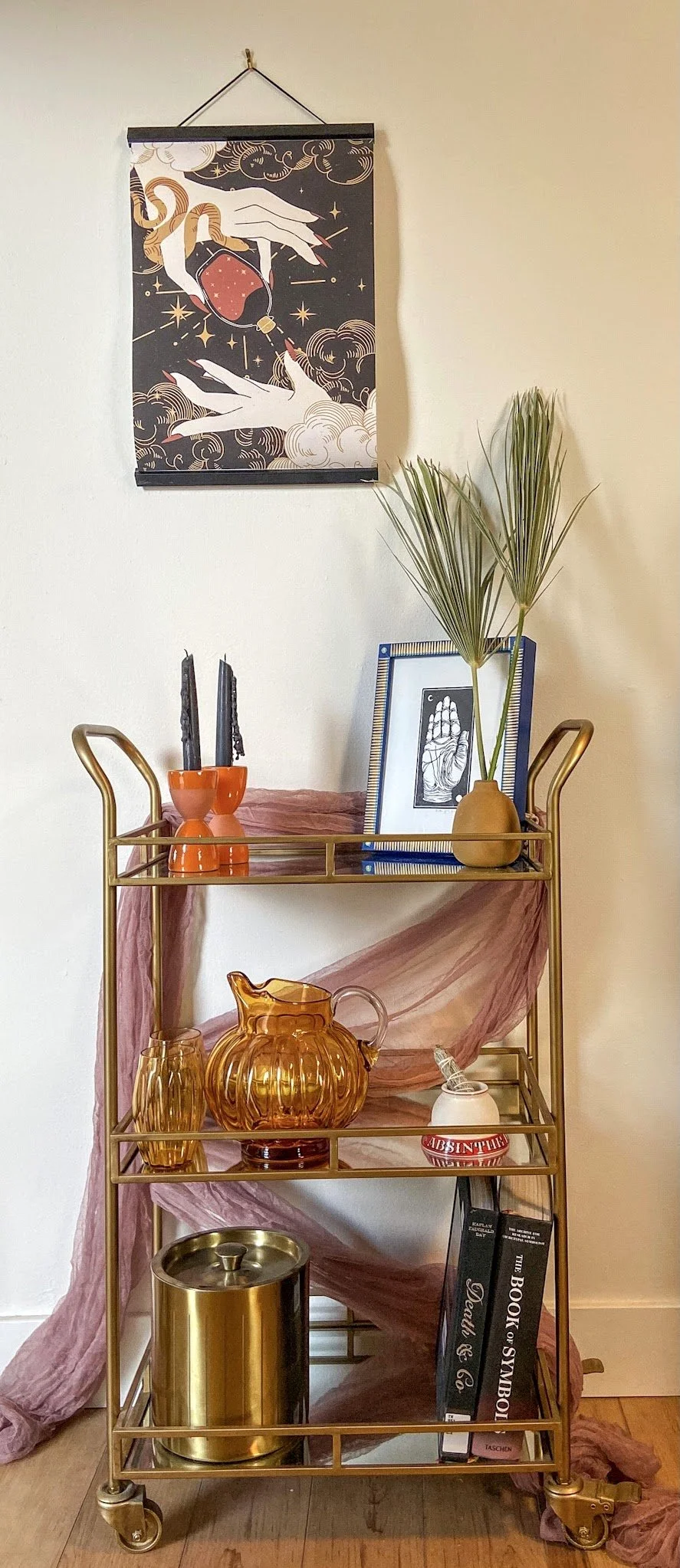 When we moved into the new house, the bar cart was one of the first things I set up. It is one of my favorite places to put the special items in my life that remind me of past adventures and memories. I particularly love messing with it around the shift of seasons and I was so excited to make a witchy bar cart for spooky season this year.