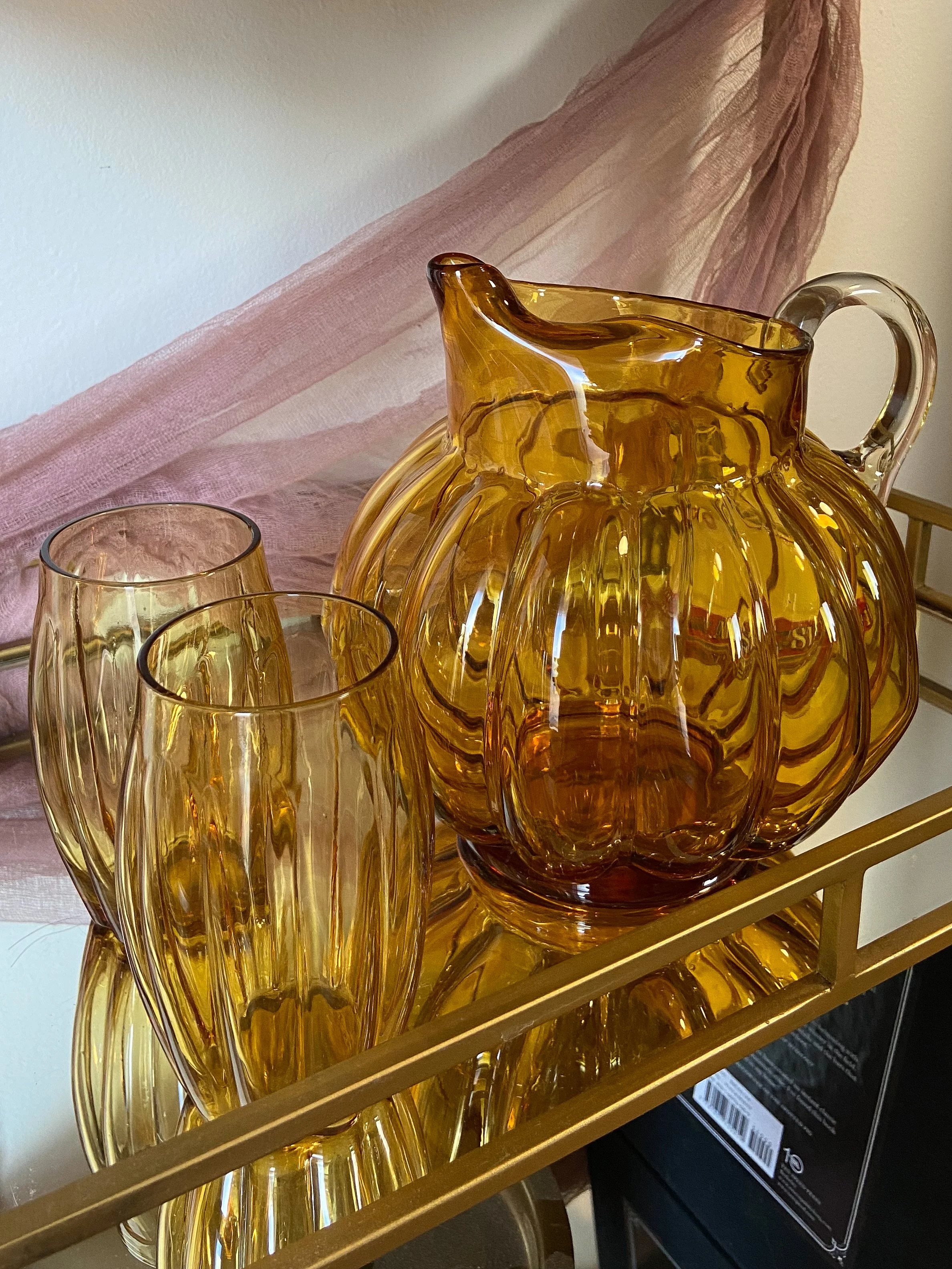 I found these like some October miracle. I was having beers with friends downtown last weekend and remembered that a favorite spot of ours, Authentik, was having a sidewalk sale. Walked in and poof - the perfect pitcher for October! I can’t find any marks to identify it and I have no clue if it was meant to be a pumpkin but it is one now! I think it will be great for Friendsgiving too!